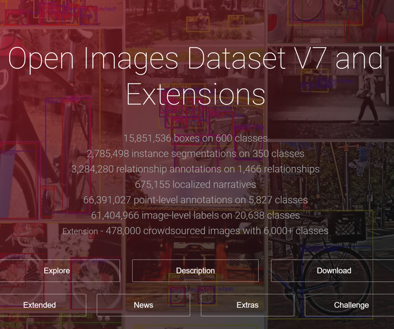 Open Images是由谷歌发布的一个开源图片数据集,在2022年10月份发布了最新的V7版本。这个版本的数据集包含了900多万张图片,都有类别标记。其中190多万张图片有非常精细的标注:bounding boxes, object segmentations, visual relationships, localized narratives, point-level labels, and image-level labels.