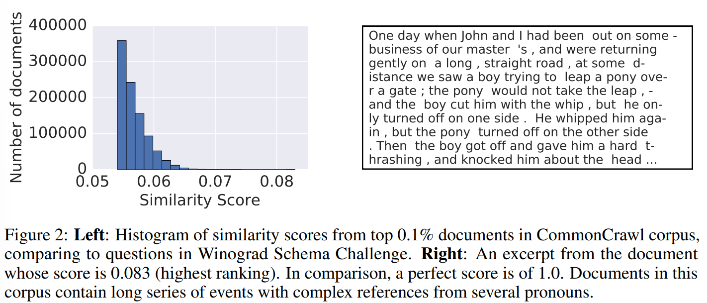 该数据集是谷歌自己构建的一个个性化数据集,并没有公布。但是论文中描述了数据集的收集方式:从CommonCrawl数据集中聚合文档,选择的条件是与Commonsense Reasoning Tasks中问题重复n-grams的结果。每个文档在计算重合的n-grams时候都采用加权求和的方式进行。最终,选择前0.1%的结果作为数据集,形成STORIES。将这个数据集命名为 "STORIES"的原因是大多数的组成文件都是以故事的形式出现的,有一长串连贯的事件。STORIES现在习惯性被叫成CC-Stories(CC就是CommonCrawl)的意思。