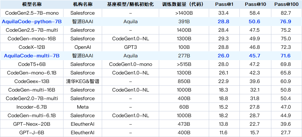 2023年7月24日,BAAI发布了2个编程大模型,分别是Aquila-multi-7B和Aquila-7B-py。前者是多语言支持版本,支持包括Python/C++/Java/JavaScript/Go等。