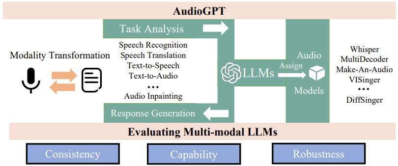 • AudioGPT利用各种音频基础模型处理复杂音频信息,而LLM(即ChatGPT)被视为通用接口,这使得AudioGPT能够解决众多音频理解和生成任务;