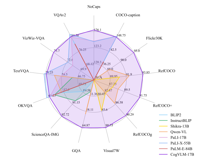 经过两阶段预训练和对齐微调后,CogVLM-17B 在 NoCaps、Flicker30K 字幕、RefCOCO 等 10 个经典跨模态任务上都取得了 state-of-the-art 的结果。与此同时,CogVLM 的 NLP 性能与原始语言模型 Vicuna-7B 完全一致。这使得 CogVLM 可以作为一个视觉增强的通用语言模型,同时处理视觉任务和语言任务。