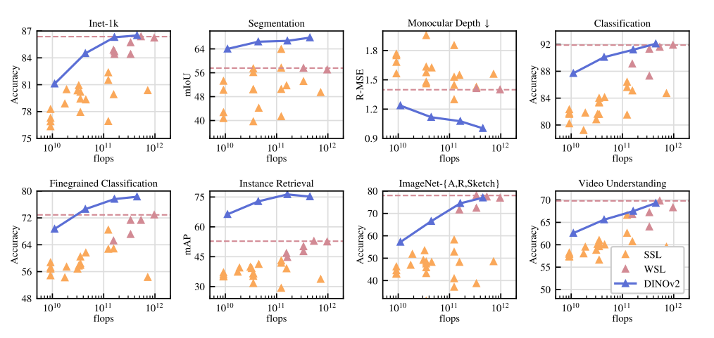 作者在8个视觉任务中做了测试,随着训练的增多,DINOv2模型的能力也在迅速提高。