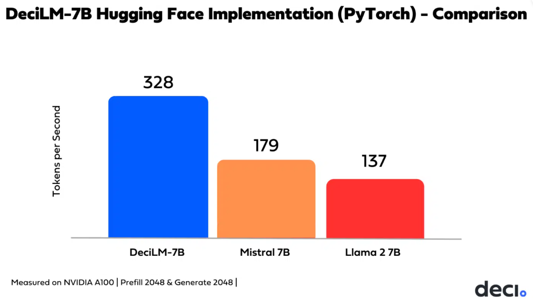 而基于PyTorch实现的DeciLM-7B的速度则是正常情况下7B模型的好几倍。如下图所示,在A100上,DeciLM-7B每秒生成的tokens数量达到328个,是Mistral 7B的1.83倍,是Llama2-7B的2.39倍!
