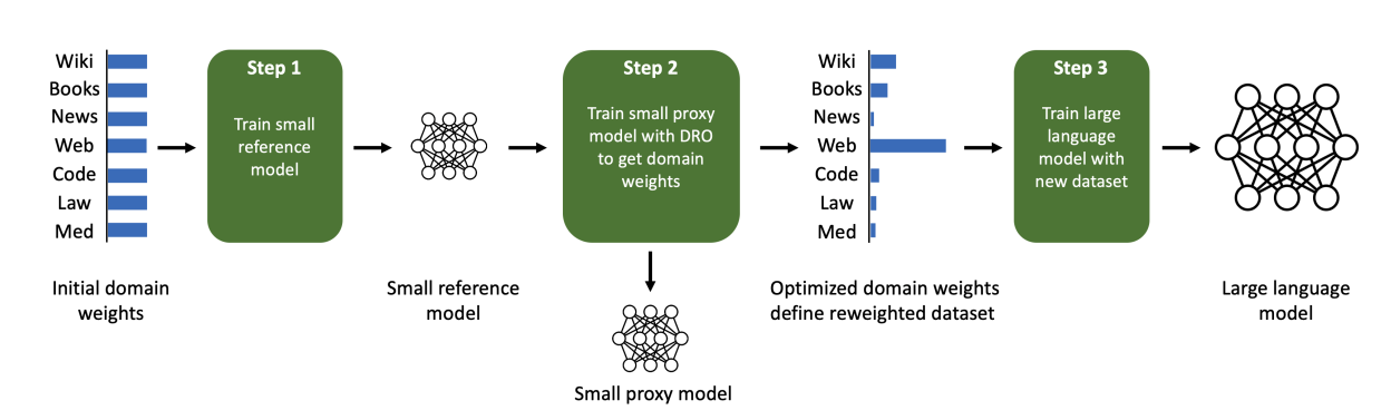 Domain Reweighting with Minimax Optimization是由Google与斯坦福大学研究人员共同提出的一种通过更改训练数据混合比例的方法提供大语言模型训练速度和性能的方法。