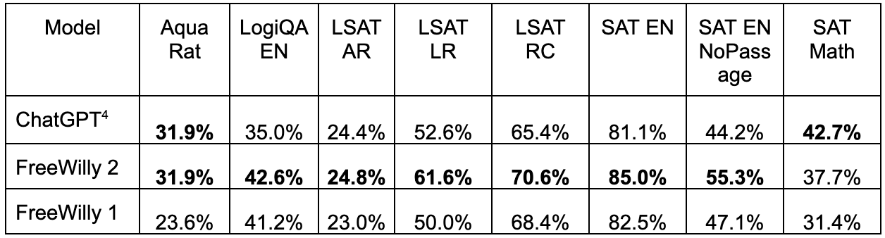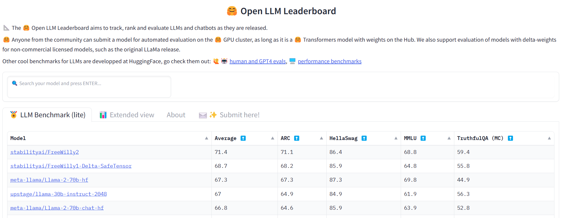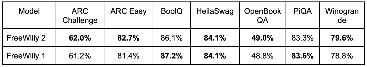 FreeWilly系列一发布就占据了各个榜单的排名靠前位置。二者的评估结果如下:
