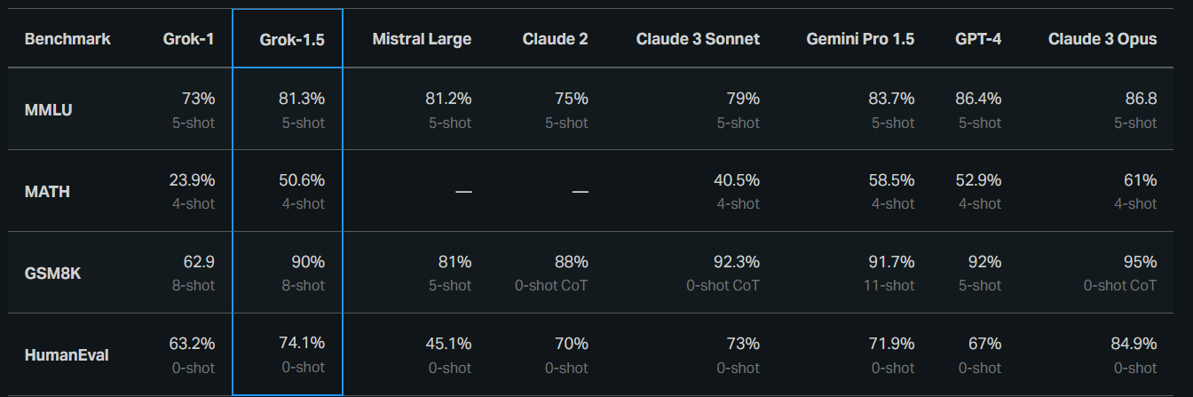 马斯克旗下xAI公司发布的Grok 1.5版本,相比较第一个版本,性能大幅提升。各项评测水平接近GPT-4。
