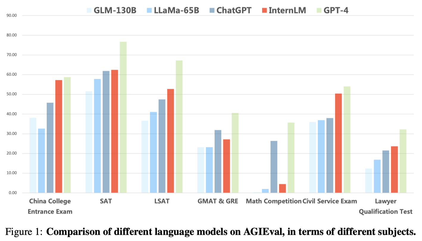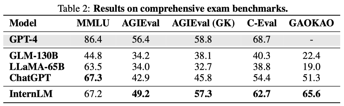 下图是与当前著名大模型的对比,可以看到,InternLM基本上是除了GPT-4外最好的模型!