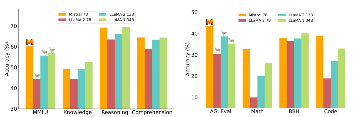 | Performance Benchmarking | Mistral 7B与其他大型模型(如 Llama 2和 CodeLlama 7B)进行了广泛的基准测试比较,展现了在多个任务和领域上的优异性能。 |