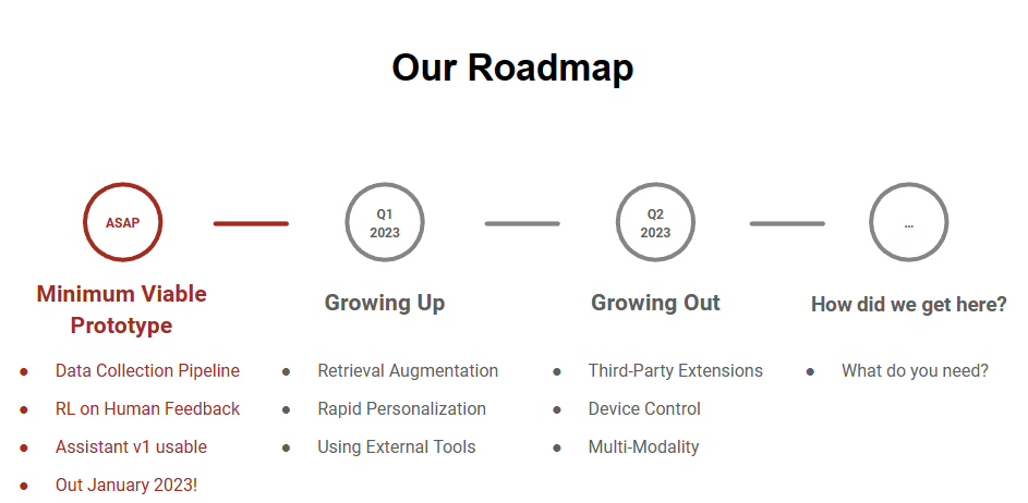 OpenAssistant LLaMA是基于MetaAI开源的LLaMA模型微调得到,目前依然在不断的训练中,官方提供的关于OpenAssistant发展的路线图如下: