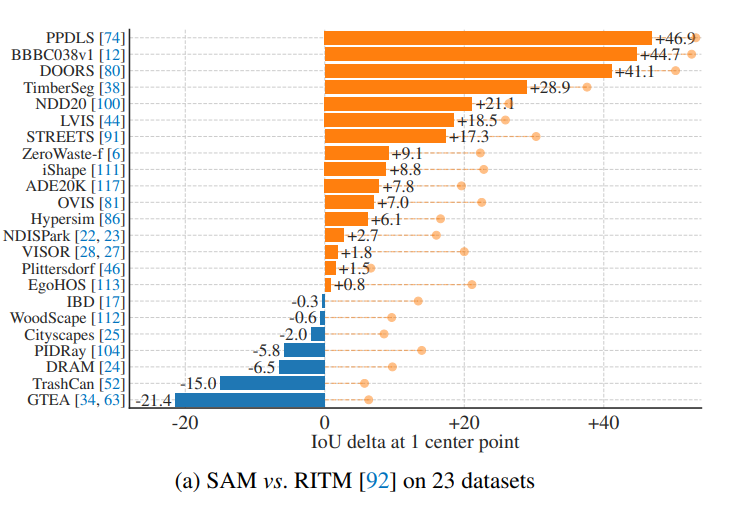 以第一个任务为例,SAM显示了强大的效果,在23个数据集上,表现大部分都好于之前的RITM: