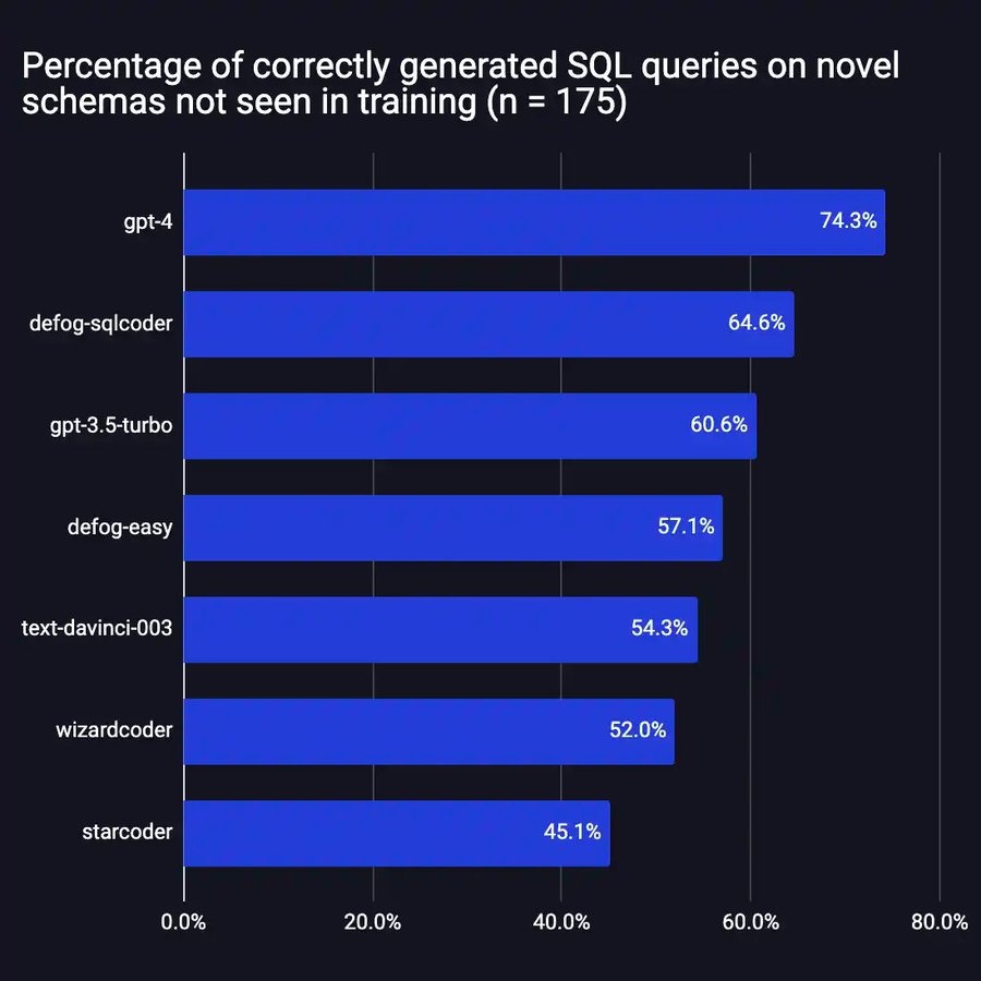 SQLCoder 是 Defog 团队推出的一款前沿的语言模型,专门用于将自然语言问题转化为 SQL 查询。这是一个拥有150亿参数的模型,在自然语言到 SQL 生成任务上,其性能略微超过了 gpt-3.5-turbo 并且显著地超越了所有流行的开源模型。更令人震惊的是,尽管 SQLCoder 的大小只有 text-davinci-003 的十分之一,但其性能却远超后者。
