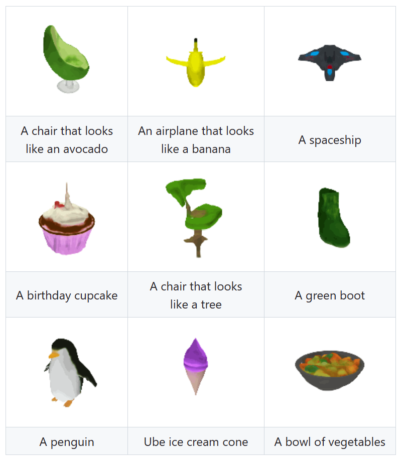 研究团队分享了Shap·E的一些结果示例,包括文本提示的3D结果,例如食物碗、企鹅、体素化的狗、篝火、长得像牛油果的椅子等等。使用Shap·E训练的模型展示了出色的性能,可以在几秒钟内生成高质量的输出。为了评估,Shap·E与另一个生成模型Point·E进行了比较,后者生成点云的显式表示。尽管建模了更高维度和多重表示输出空间,但Shap·E在比较中显示出更快的收敛速度,并实现了可比较或更好的样本质量。