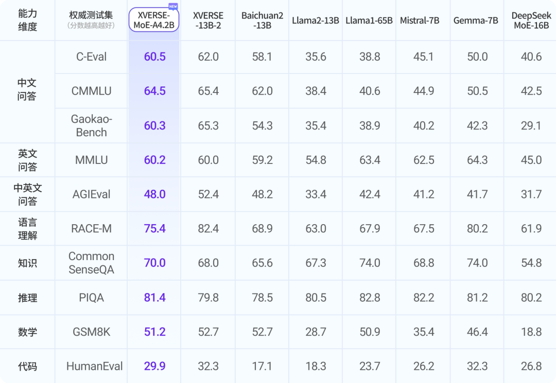 XVERSE-MoE-A4.2B 是由深圳元象科技自主研发的支持多语言的大语言模型(Large Language Model),使用混合专家模型(MoE,Mixture-of-experts)架构,模型的总参数规模为 258 亿,实际激活的参数量为 42 亿,本次开源的模型为底座模型 XVERSE-MoE-A4.2B,主要特点如下: