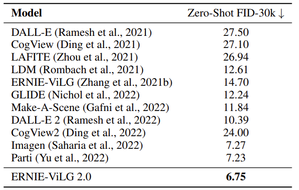 可以看到,在MS-COCO 256 × 256数据集上做的文本生成图像实验中,ERNIE-ViLG2.0的效果最好。