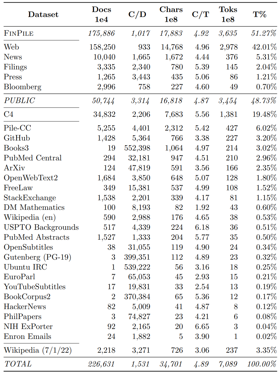 Bloomberg终端在过去40年中提供了全面的结构化和非结构化金融数据和分析。为了实现这一目标,Bloomberg分析师策划了一组金融文档,这些文档要么是内部创建的,要么是从外部来源获得的。我们利用这一广泛的、精心策划和维护的文档集合创建了FinPile,其中包括公司申报文件、金融新闻和其他与金融市场相关的数据。