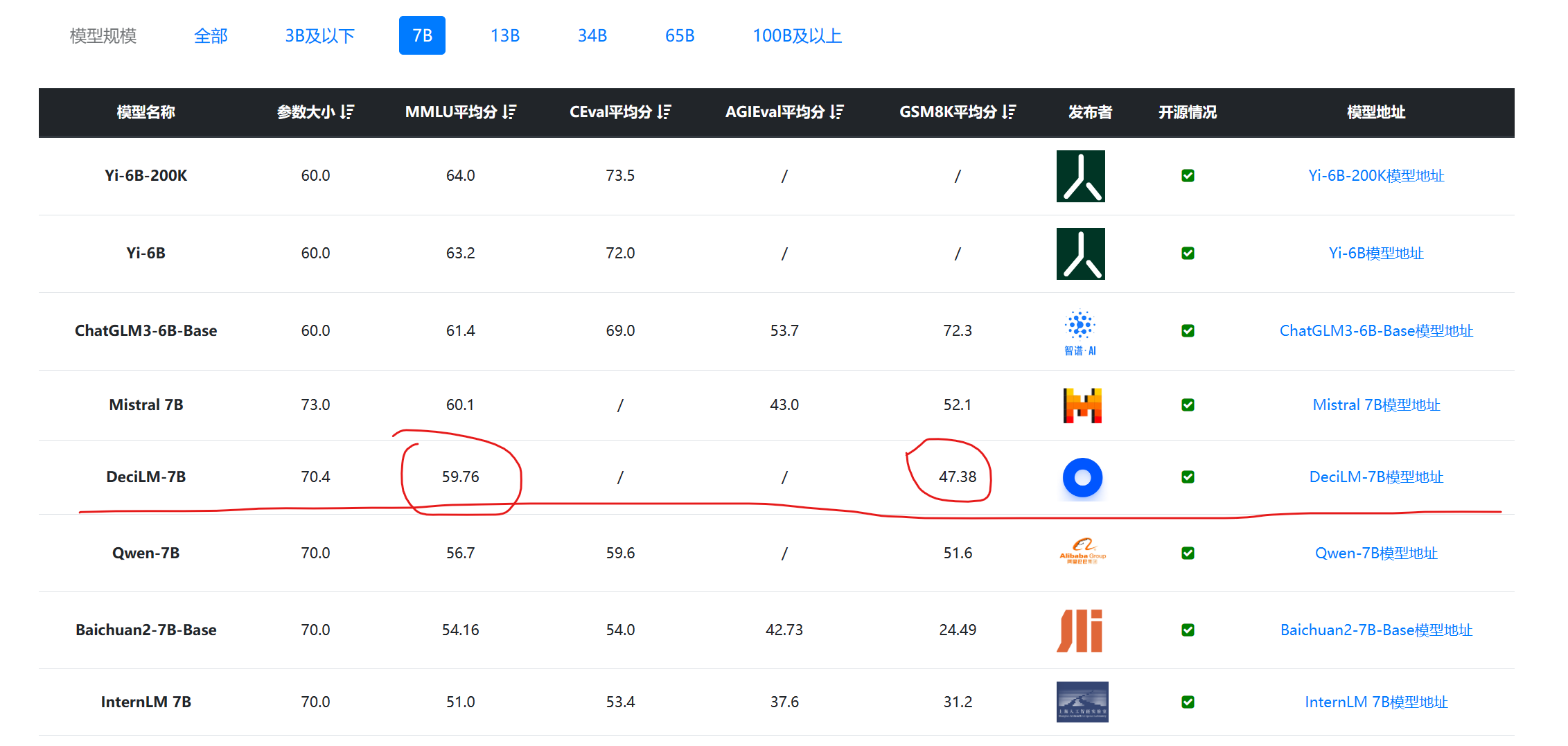 详情参考: https://www.datalearner.com/ai-models/llm-evaluation?modelSize=7b
