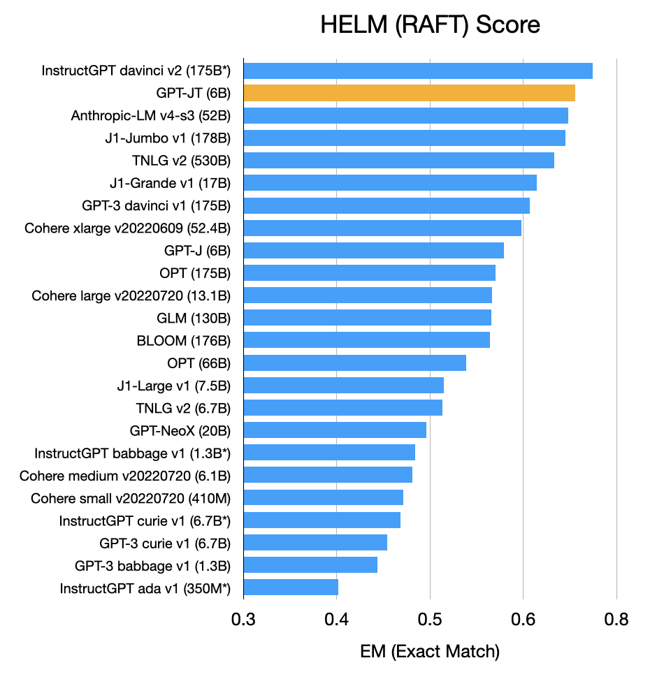 在EleutherAI发布GPT-J 6B几个星期之后,TOGETHER就在官方宣布开源GPT-JT模型。该模型继续在GPT-J基础上,基于35.3亿tokens数据进行微调,尤其擅长文本分类任务,其效果好于100亿参数规模的模型。