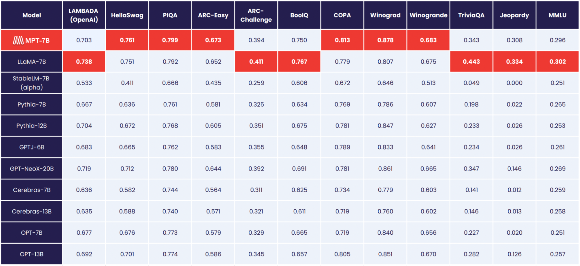 从这些特点看,MPT真的是一个很优秀的开源大模型,且官方宣称它的评测结果与LLaMA-7B差不多。