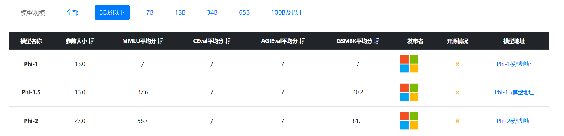 Phi系列的综合水平: https://www.datalearner.com/ai-models/llm-evaluation?modelSize=3b