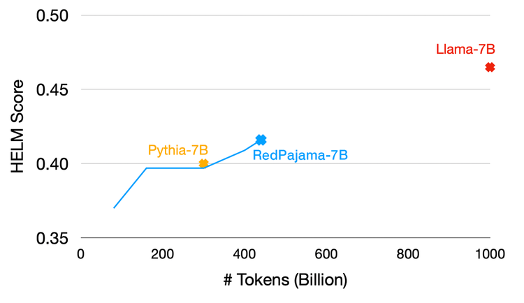 使用Pythia架构的7B RedPajama基础模型在HELM评分上获得了比Pythia-7B更高质量的结果,这是一次中期训练的检查点。