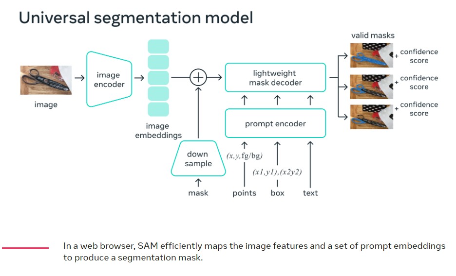 这个方法的核心如上图的Figure 1b所示!通过将SAM分解为一个图像编码器和一个快速提示编码器/掩码解码器,可以重用相同的图像嵌入(并摊销其成本)来处理不同的提示。给定一个图像嵌入,提示编码器和掩码解码器在Web浏览器中从提示中预测出掩码需要约50ms的时间。