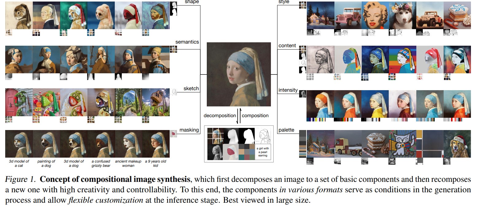 Composer,是组合式生成模型的实现。组合式生成模型,是指能够无缝地重新组合视觉组件以产生新图像的生成模型(图1)。具体来说,我们将Composer实现为一个具有UNet骨干的多条件扩散模型(Nichol等人,2021)。在Composer的每次训练迭代中,有两个阶段:在分解阶段,我们使用计算机视觉算法或预训练的模型将一批图像分解成单独的表征;而在组成阶段,我们优化Composer,使其能够从其表征子集中重建这些图像。尽管只用一个重建目标进行训练,但Composer能够从未曾见过的表征组合中解码新的图像,这些表征可能来自不同的来源,并且可能彼此不兼容。