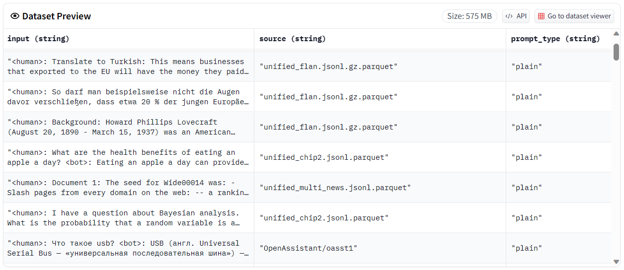 使用的是h2ogpt-oig-oasst1-instruct-cleaned-v1数据集做微调。H2O.ai 的 h2ogpt-oig-oasst1-instruct-cleaned-v1 是一个用于大型语言模型微调的开源指导类型数据集,可用于商业用途,包含349837条数据,共575MB。数据集的每一条有3列,分别是输入、来源和prompt_type。数据样例如下: