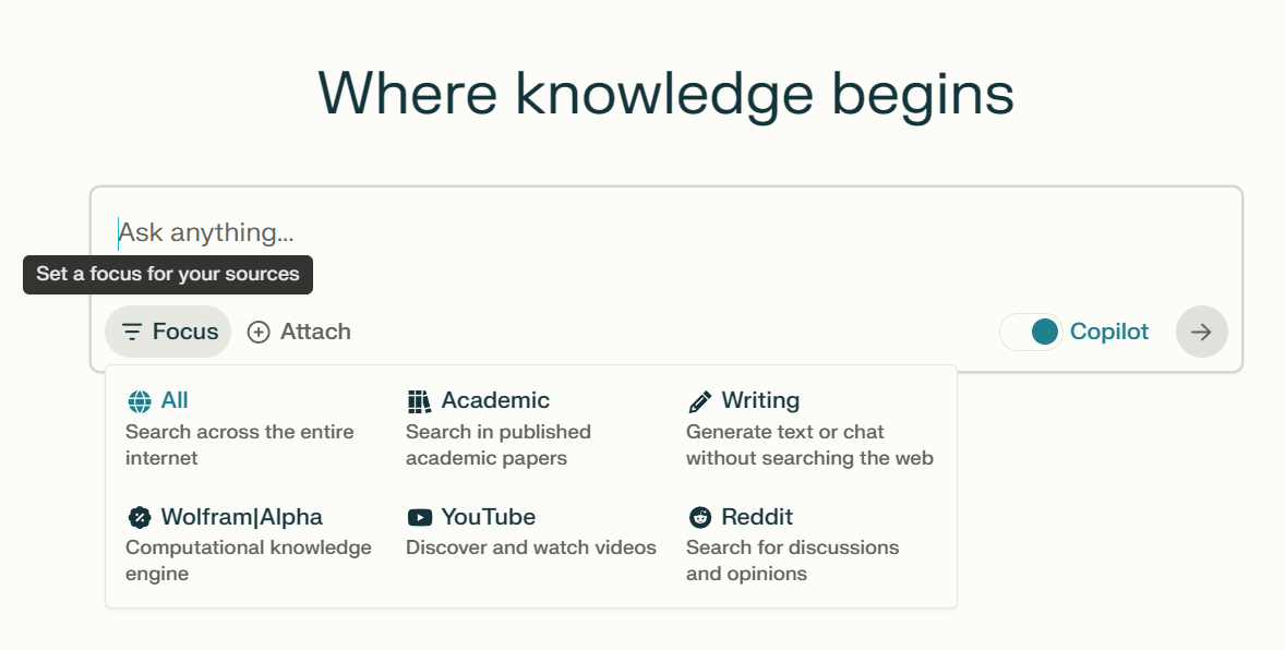 PerplexityAI的产品是一个对话式搜索引擎,即perplexity.ai。perplexity.ai的产品最早是网页端,后来推出了客户端。均提供免费的产品。在搜索范围上,为了提供更加精确的结果,perplexity.ai的搜索范围支持几种不同的定制: